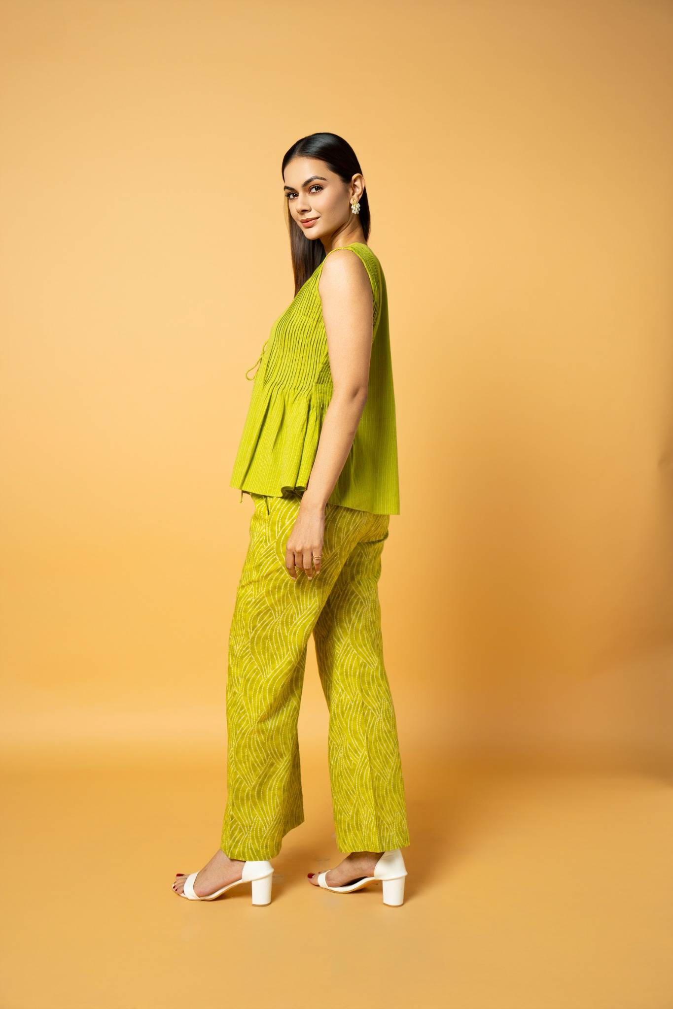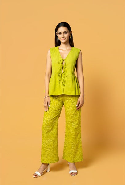 A chic cotton Bandhej co-ord set featuring a modern sleeveless tie-up top paired with printed Bandhej pants.