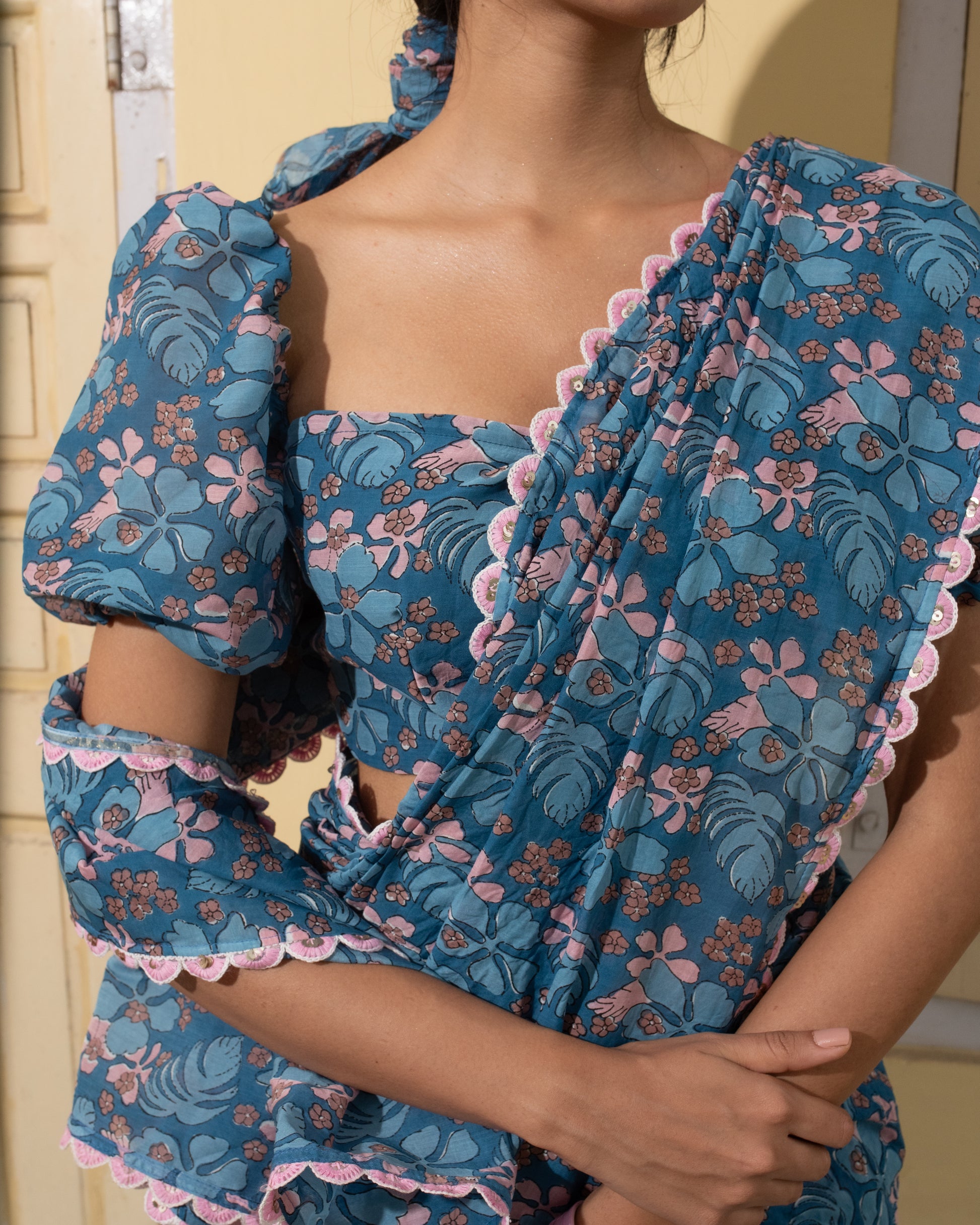 Blouse Fabric: Crafted in matching mul cotton with delicate beaded straps and scallop-detail lace, offering structure and elegance while remaining comfortable against the skin.