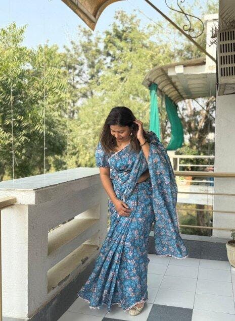 A soothing blue mul cotton floral print saree, paired with a stitched puffy half-sleeves blouse. The blouse adds a romantic, contemporary touch, while the lightweight cotton saree ensures comfort—perfectly blending elegance and modern shringaar for any occasion. Perfect for those seeking a Designer saree that blends tradition with elegance — an ideal choice for Festive saree and Party wear saree, crafted to reflect the essence of a Luxury saree.